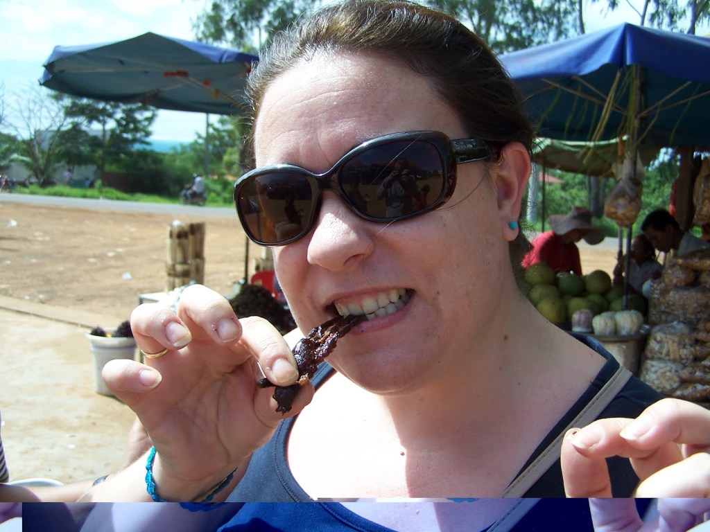 La primera parada ha sido en una especie de bar de carretera con mercadillo en el aparcamiento, en un pueblo al que el amigo Thie ha llamado «Spider Village». El bonito nombre viene de que es ahí dónde se comen las tarántulas. Bueno, las tarántulas y las larvas de los gusanos de seda, las ranas, los saltamontes y, oh delicia entre las delicias, las cucarachas. Adivinad quién ha probado de todo… No las cucarachas, que eran muy grandes y de un bonito color marrón, pero mi señora no sólo ha probado todo lo demás, sino que le han gustado tanto las tarántulas (una de las cuales, viva, se ha paseado por su mano como parte de la atracción turística) que le ha pedido a Thie que le comprara una entera para comérsela ella solita. Asqueroso…
