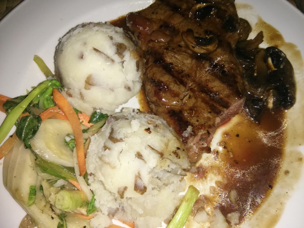 Luego hemos cenado en el pintoresco (y turístico) restaurante de al lado, llamado «Rakam» (sí, como el pirata de Tintín). No ha sido gran cosa, muy dirigido al público americano mayoritario por aquí, que sólo valora el tamaño de las raciones y no la calidad del contenido. Elena ha pedido «Fish and Chips», el único plato destacable de la famosa gastronomía británica, y que por supuesto no ha tenido nada que ver con lo que vendían en los puestos callejeros de Londres que yo conocí cuando era niño y que todo el mundo que haya ido a Inglaterra habrá probado. A mí me han traído un entrecot cutre lleno de salsas y guarniciones que a los yankis les parecerá maravilloso, pero a mí me ha resultado mediocre…Y, por cierto, nos han preguntado por tercera vez qué de dónde éramos. Este año lo exótico no es el destino, lo exótico somos nosotros, españolitos en un lugar a dónde sólo vienen americanos.