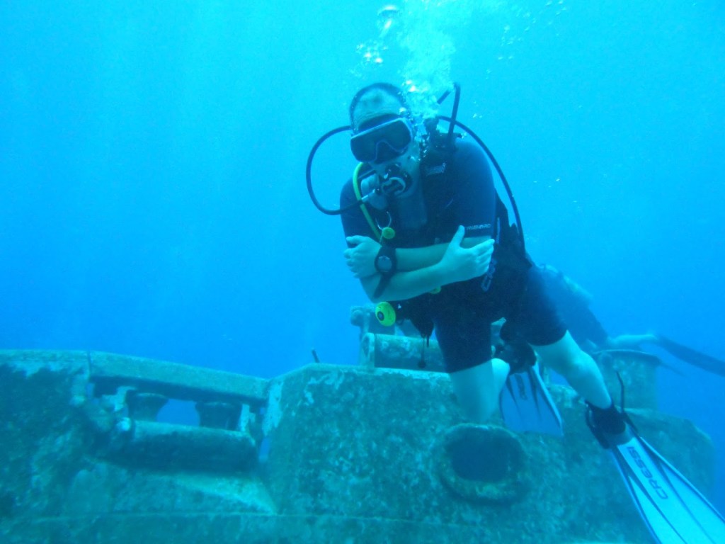 Hoy hemos hecho una de las mejores inmersiones de nuestra corta carrera como buceadores. Aparte de las dos diarias que tenemos contratadas, y que se hacen por la mañana, hemos ido por la tarde a ver un barco hundido. El USS Kittywake, un cazasubmarinos americano de la guerra de Corea, que fue retirado del servicio en los años 70 y se hundió como atractivo turístico para buceadores. La inmersión, técnicamente, es muy fácil, la cubierta superior del barco está a apenas 5m de la superficie, y todo el barco mide unos 50m de largo. Le quitaron todo lo que pudiera estorbar o contaminar y lo hundieron enfrente de una playa.