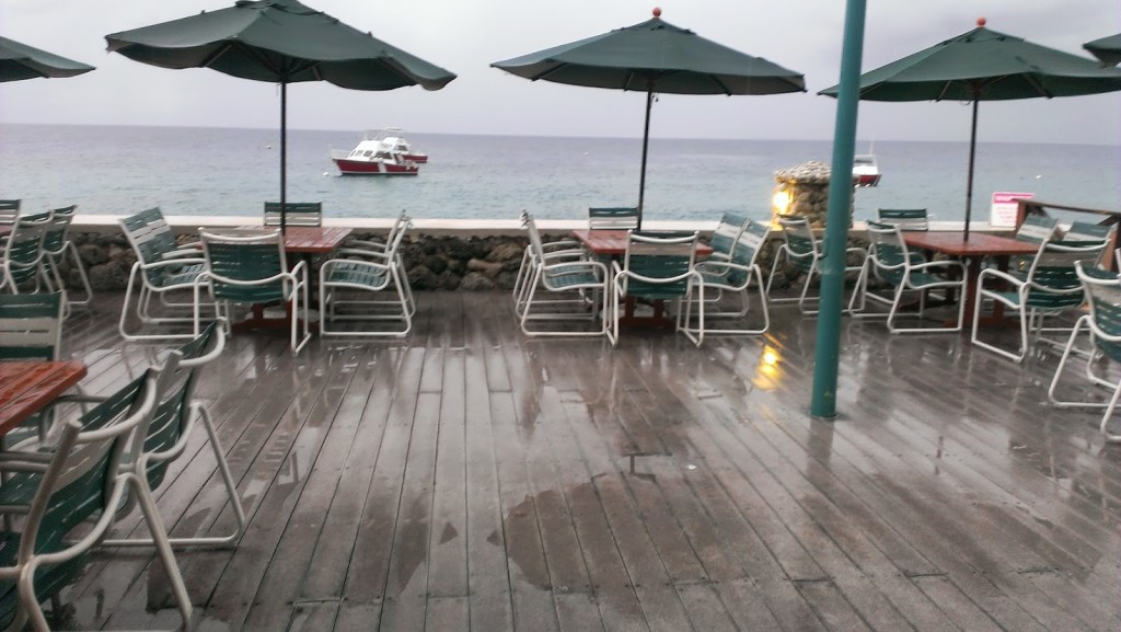 Lleva dos días lloviendo como si se fuera a acabar el mundo. Si uno viene al trópico, es de esperar que se produzcan chaparrones diarios, de cierta intensidad y duración en general breve, pero lo que hoy nos han echado encima no tiene explicación. Ha estado lloviendo a cántaros desde que nos levantamos a las 6 y media de la mañana hasta que hemos ido, desesperados, al bar del hotel sobre las 5 de la tarde (foto adjunta de la terraza). El jarreo era de tal calibre que el tío que llevaba el barco ha tenido que ponerse las gafas de bucear para conducirlo. Menos mal que venimos a bucear y no a tirarnos en la playa…