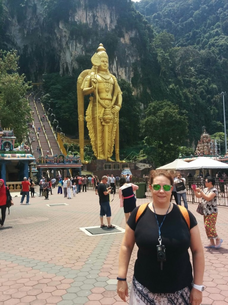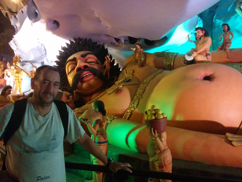 Total, que en poco mas de media hora nos hemos plantado en las afueras, en un sitio muy turístico llamado Batu Cave, que es un complejo de lugares sagrados para los budistas. Justo al salir de la estación de tren hay una cuevecilla que han llenado de estatuas contando algún tipo de historia sagrada de la que no hemos entendido nada, básicamente por la risa que nos ha entrado al ver la composición central que podéis admirar en la foto adjunta. Nótese la expresión facial del santo, capturada con gran realismo en lo que parece ser su funeral despues de una borrachera monstruosa, y el gran lujo de detalles hiperrealistas de sus características físicas: Bigote, barriga, tetas y dientes. No me cabe duda de la gran altura espiritual del personaje, si para relatar su vida y milagros han llenado una cueva entera con cientos de estatuas, pero al artista habría que atarlo a un poste en la plaza pública para que la gente le tirara tomates durante días, por hortera…