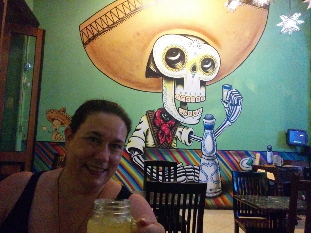 Aquí abajo, foto del bonito y pintoresco mejicano de la cena y de una de sus clientes mas felices degustando una de sus famosas margaritas clásicas con sal. Unos tacos macanudos, güey, aunque el pendejo del mesero parecía regañao y se quedó sin propina, por chingón…