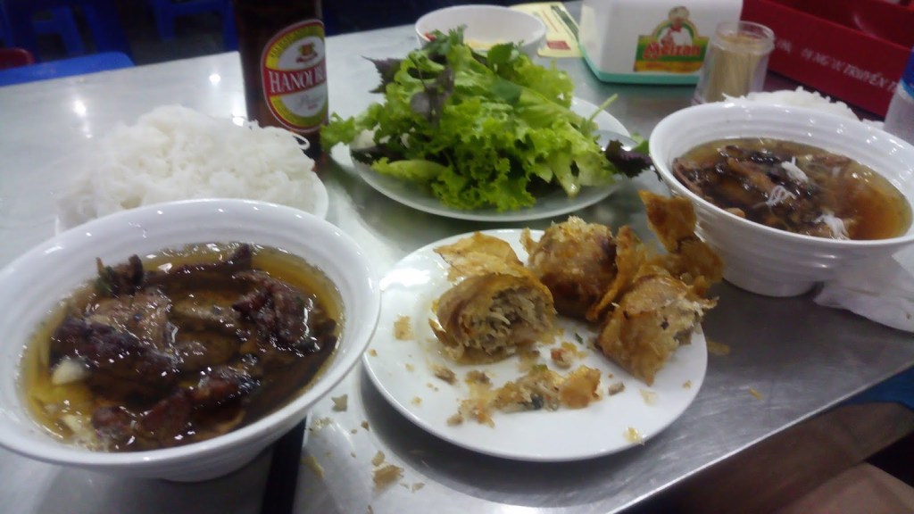 Esto del Bun Cha consiste en dos platos, un mega rollo de primavera relleno de gambas, pescado y carne, sin apenas verduras, y un bol de sopa con carne de cerdo guisada al que se le echan fideos de arroz y lechuga. Todo acompañado de una Hanoi Beer del tiempo. No está mal. Aunque sólo sea por la gracia de lo de Obama ha estado gracioso. Y barato, Me ha costado la friolera de 186000 dongs (casi 7€). Menos mal que al salir del hotel hemos ido al cajero a sacar millón y medio de dongs, porque no admiten tarjetas. Seguro que a Obama la cerveza se la dieron fría…