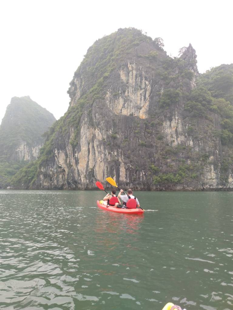 Una vez llegados a destino, te montan en una barcaza como de desembarco de tropas pero de madera, te ponen un chaleco salvavidas que apesta a podrido y te llevan al barco dónde vas a hacer el crucero por la bahía. No gran cosa, el barco, mas o menos igual que las docenas de cruceros que se ven en el puerto por todas partes. Por donde mires. Reparten los camarotes (no entremos en detalles salvo el de que la ducha, el váter y el lavabo han sido instalados de forma, digamos, ingeniosa, para ocupar el menor espacio posible) y te explican el plan: Primero la comida (ni reseña voy a hacer), y un par de horas mas tarde, una paseo en kayak a ver unas cuevas y luego un bañito refrescante.