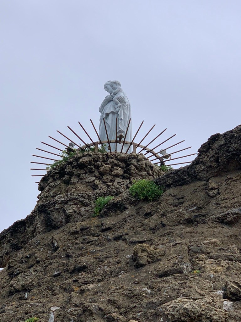 Después de «comer» porque hicimos un poco dieta adrede.. nos fuimos a investigar el paseo que sube hasta el acuario de Biarritz y lleva hasta la Vierge des Roches (la Virgen de la Roca, como en MI Baiona!!) es una estatua pequeñita de una Virgencita en piedra blanca subida en un risco, cuenta la leyenda que, una vez, varios marineros deseaban entrar en el puerto de pescadores mientras una feroz tormenta les impedía el regreso y de pronto un rayo de luz los absorbió y los condujo al puerto sanos y salvos. Como agradecimiento colocaron la estatua de la Virgen allí en el año 1865, es un mirador muy bonito al que se accede por una pasarela sobre el mar, desde la que se estaban tirando unos chavales la mar de arrichados (por cierto) y donde parecía que “regalaban algo” al que la cruzase… no os podéis imaginar la cantidad de familias, parejas, perros, niños y demás que había allí estábamos una multitud, menos mal que al aire libre y nosotros separaditos, porque es curioso que en Francia parece que no hay COVID… volviendo al mirador de la Virgen de la Roca, desde allí se ve la playa de Biarritz a lo lejos y es un paseo muy bonito por la costa.