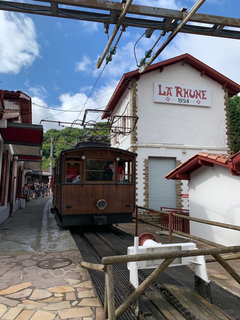 Amanecimos a las 8:00 de la madrugada para ponernos en marcha, hacer el check-out – que ya dejábamos el hotel de Bayonne – y ponernos en ruta hasta Sare, donde teníamos ya los billetes para Le Train de la Rhune o en español el Tren de Larrún , recomendación de mi amigo Lucas, que nunca falla. Llegamos con bastante tiempo de antelación y, menos mal, porque el parking es pequeño para la cantidad de gente que hay (como todo Francia esto estaba hasta la bandera de turistas tanto franceses como españoles); y aunque nos costó un ratillo encontrar sitio para el coche, al final lo conseguimos. Aun así tuvimos media hora larga hasta la salida de nuestro tren. El tiempo estaba a chaparrones tontos, tipo chirimiri o calabobos… íbamos muy bien pertrechados, con los chubasqueros así que, sin problema. Nos subimos al pintoresco trenecito, que es un tren cremallera; por si os lo estáis preguntando, no lo busquéis que ya lo he hecho yo: Se denomina ferrocarril de cremallera a un tipo particular de ferrocarriles que basa su funcionamiento en el acople mecánico con la vía por medio de un tercer riel dentado o «cremallera», eso es un tren cremallera. Este data del año 1924 y en 35 minutos nos subió a 905 metros de altura. La situación de la cima a la que subes es territorio español, concretamente provincia de Navarra, así que cruzamos la frontera por primera vez en esa mañana.