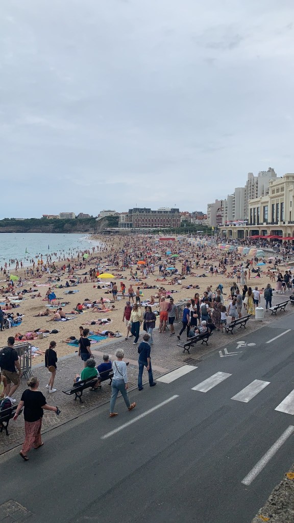 Día 4 – Martes 3 de agosto – Biarritz. El martes por la mañana nos despertamos tranquilamente y cuando estuvimos listos pusimos rumbo a Biarritz, en 15 mins (porque había traficazo) llegamos y dejamos el coche en una de las 7 últimas plazas que había en uno de los parkings de la zona centro, estaba la ciudad que parecía una romería. Nos dimos un paseo por la zona de la playa, yendo desde el Casino que data del año 1929, construido por el arquitecto Alfred Laulhé y que fue reformado en 1990 y catalogado como monumento histórico en 1992.