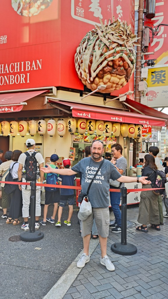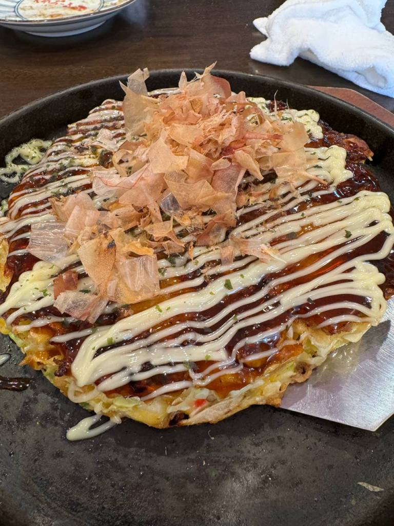 Al menos hemos comido bastante bien, nuestro ChatGPT (que, junto con google maps se ha convertido en el mejor recurso para viajar) nos ha recomendado un sitio cercano para comer los típicos takoyaki, que son unas pelotas rebozadas rellenas de un puré con trocitos de pulpo y empapadas en una salsa de sésamo que están buenísimas. Para completar, un okonomiyaki, una especie de torta de harina rellena de marisco coronada por lascas de atún muy finas que, con el calor, se mueven como si estuvieran vivas. Muy rico todo…